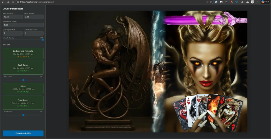 I whipped up this handy book cover tool that lets you drag a back, spine, and front image and composite them with optional spine alpha blending. It’ll handle images that aren’t the exact right sizes, cropping and overlapping them as needed to make your cover look nice.